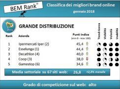 Ricordiamo che a gennaio 2018 BEM Rank prende in considerazione in considerazione i seguenti brand nella Gdo per i quali viene analizzata mensilmente la performance online: Alì Supermercati, Auchan, Bennet, Bricocenter, Carrefour, Cisalfa, Conad, Coop, CTS Supermercati, Decathlon, Despar, Dok Supermercati, Doro Supermercati, Emi Supermercati, Esselunga, Euronics, Famila, Gamestop, Gros, Huffington Post, Iperdrive, Ipermercati Iper, Leon Supermercati, Mediaworld, Primark, Sigma, Supermercati Contè, Supermercati Dem, Supertosano, Tigre Supermercati, Todis, Unieuro.