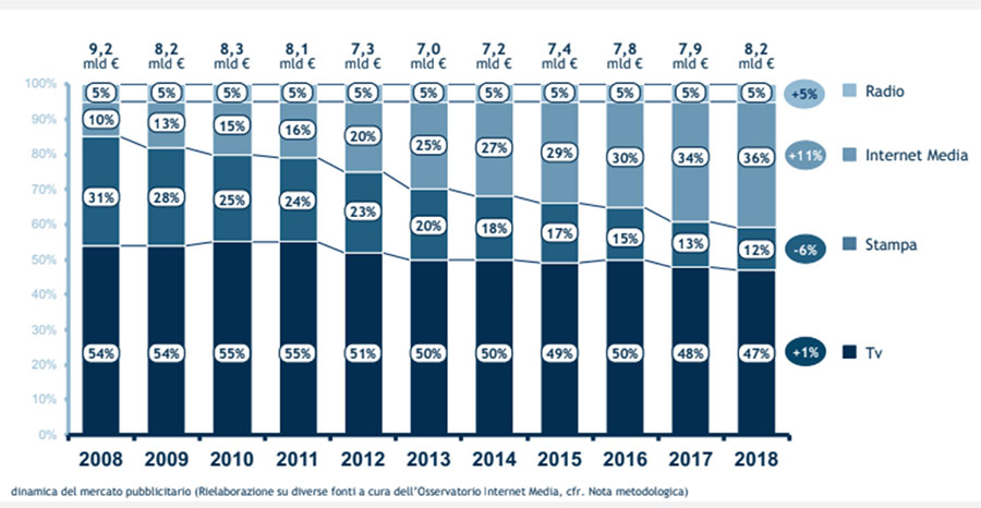 Da sottolineare in particolare come nel 2018 il mercato sia tornato ai livelli del 2009, ossia ad una quota di 8,2 miliardi di euro. A parità di valore assoluto, in 10 anni Internet ha guadagnato 7 punti percentuali di quota di mercato sulla Televisione e ben 16 punti percentuali sulla Stampa.