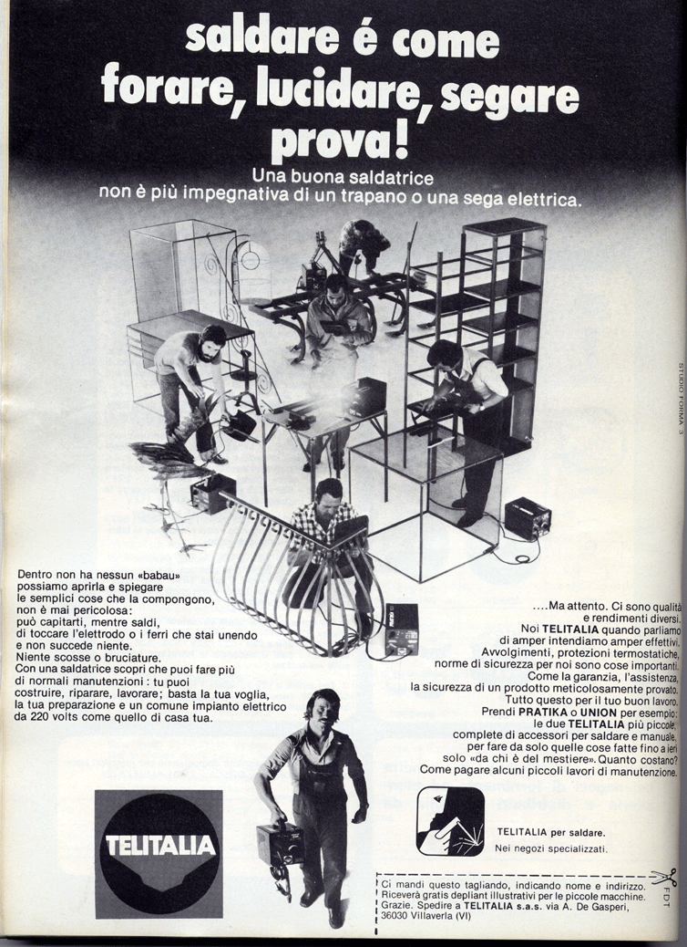 Le aziende erano le uniche che tentavano con la comunicazione di fare un po’ di chiarezza e di sdrammatizzare l’intervento fai da te. Sintomatiche in questo senso sono le pubblicità di Peugeot, dove quasi si prende in giro l’hobbista che ha bisogno di un “coso” per fare una “cosa” o quella di Telitalia, che cerca in tutti i modi di far capire che saldare non è un’operazione difficile e pericolosa, ma è come forare, lucidare, segare: basta provare.