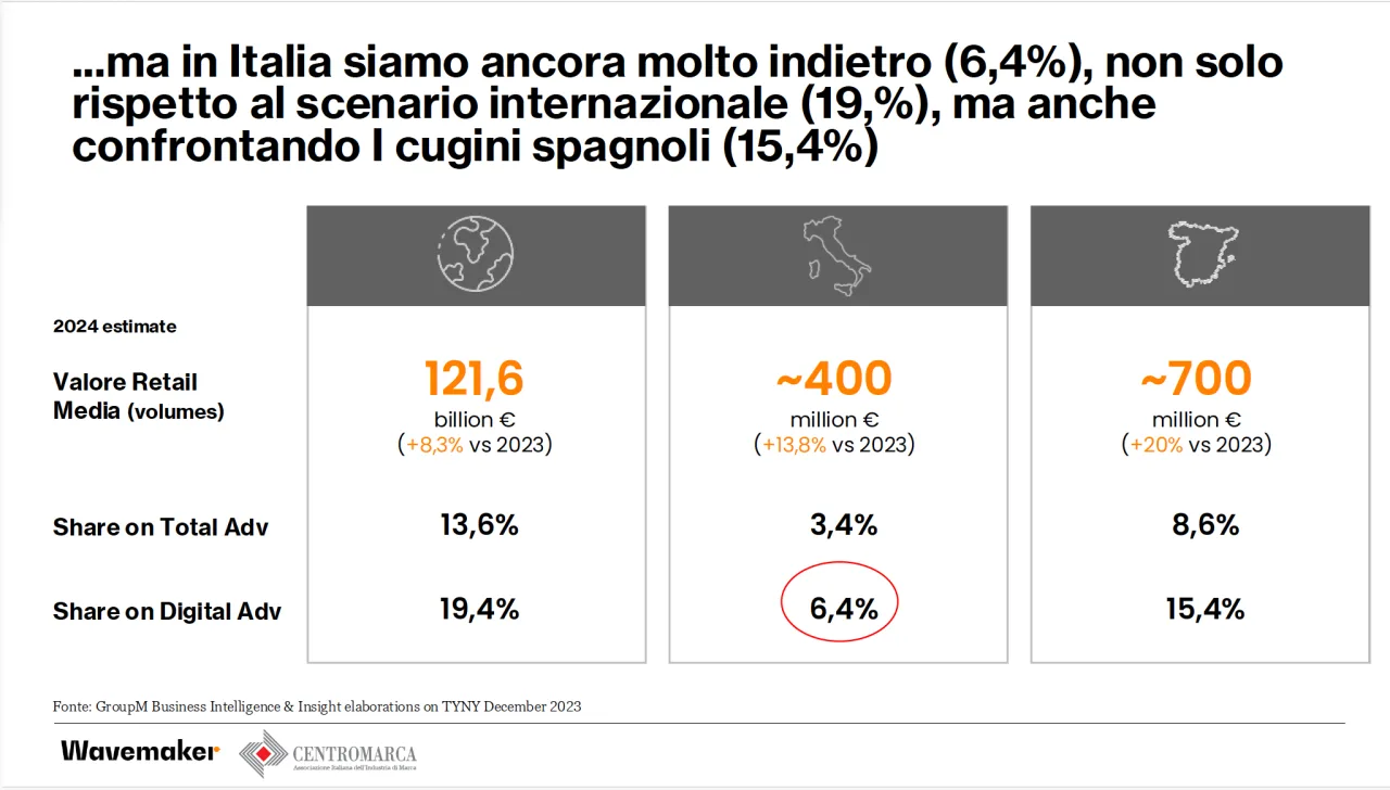 Per ciò che riguarda specificamente l’Europa, entro il 2027 si arriverà a 25 miliardi (fonte Iab-Statista). Attualmente il peso del retail media sull’adv digitale è del 10% – l’Italia è più o meno in linea al 9% –, ma si prevede raggiungerà il 21,5% nei prossimi 3 anni.
