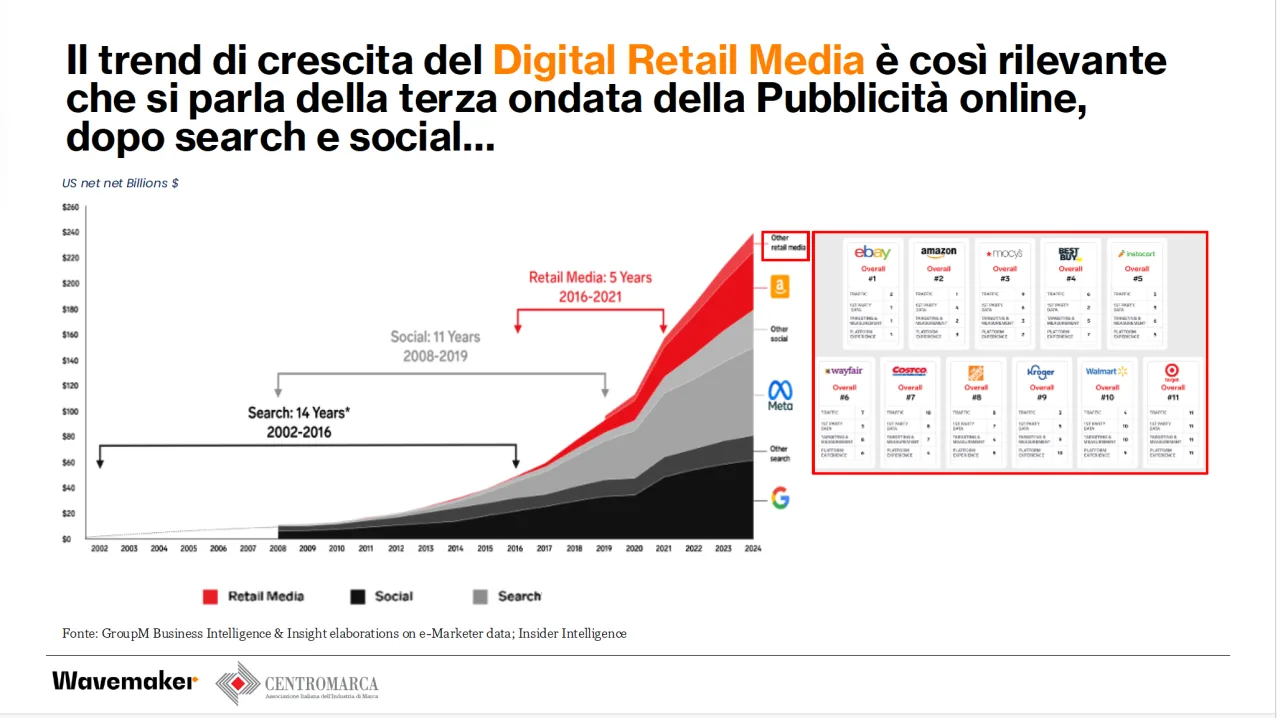 Grazie al retail media i punti vendita si trasformano in canali pubblicitari, permettendo così ai brand di raggiungere i consumatori nel momento più vicino all’acquisto. Stiamo parlando di un mercato che, secondo Morgan Stanley, entro quest’anno raggiungerà i 130 miliardi di dollari, pari al 25% della spesa adv online complessiva.