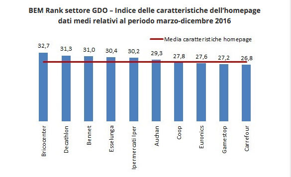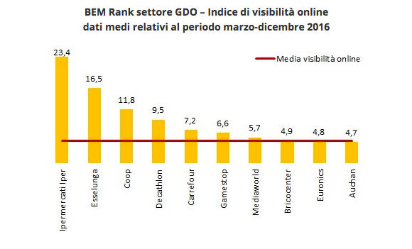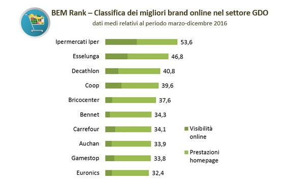 Tra i primi 10 brand si trovano poi Bennet, Carrefour, Auchan, Gamestop ed Euronics. Nel complesso, la media del BEM Rank nel 2016 per i circa 25 brand del settore Gdo considerati è pari a 33 punti.