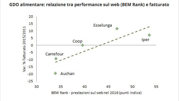 “Concentrandosi solo sui principali gruppi (italiani e non) della GDO alimentare, e guardando alla relazione tra le performance sul web e la dinamica del fatturato degli ultimi anni, – commenta Mariachiara Marsella, web marketing manager di BEM Research – si riscontra un legame strettamente positivo. In altri termini, chi ad oggi fa meglio sul web è riuscito negli ultimi anni ad avere un miglior rapporto con la clientela, soprattutto attraverso i tradizionali canali di vendita, e quindi a vendere di più. Ciò evidenzia l’importanza del phygital, parola che nasce dall’unione di physical e digital, ovvero quanto sia cruciale interagire con gli utenti con strumenti digitali anche quando le vendite avvengano prevalentemente attraverso i canali fisici (o analogici). In questo contesto sembrano fare eccezione le catene di discount, che pur avendo ottime performance in termini di vendite, non rientrano tra i migliori brand della nostra classifica. Il target di clientela, meno digitalizzata, può però spiegare questo risultato. Tra non molto tempo, quando i nativi digitali saranno più attivi sul mercato, si può facilmente prevedere che anche questi distributori dovranno porre più attenzione al web”.