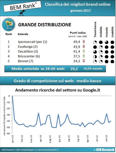 E’ quanto dichiarato da BEM Research, una start-up che si occupa di big data, ricerca economico-finanziaria e web marketing, e che ha appena rilasciato le ultime rilevazioni sulle insegne della Gdo più performanti sul web, nel 2016.