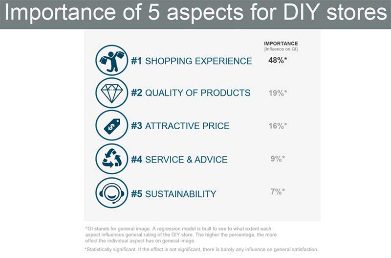 L’immagine qui sopra mostra quanto siano importanti cinque aspetti dei negozi di bricolage per la loro immagine tra i consumatori. Alcuni sono in qualche modo ovvi, come non è sorprendente che il prezzo e la qualità dei prodotti contino. Ciò che colpisce davvero, però, è l’importanza che i consumatori danno alla loro esperienza di acquisto. Di tutti gli aspetti, l’esperienza d’acquisto influisce maggiormente sulla loro opinione generale, molto più degli altri aspetti.