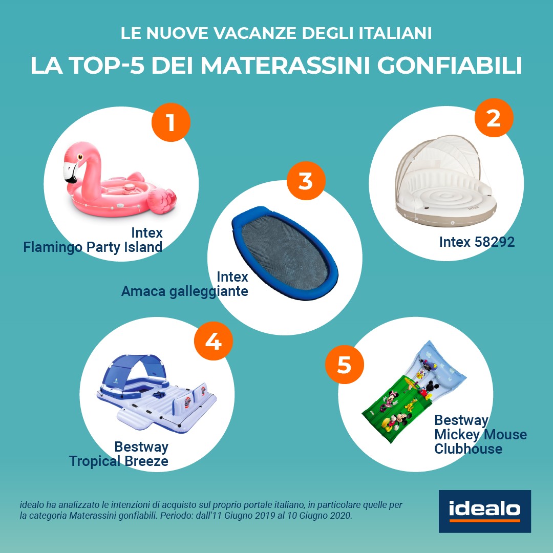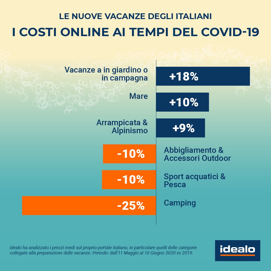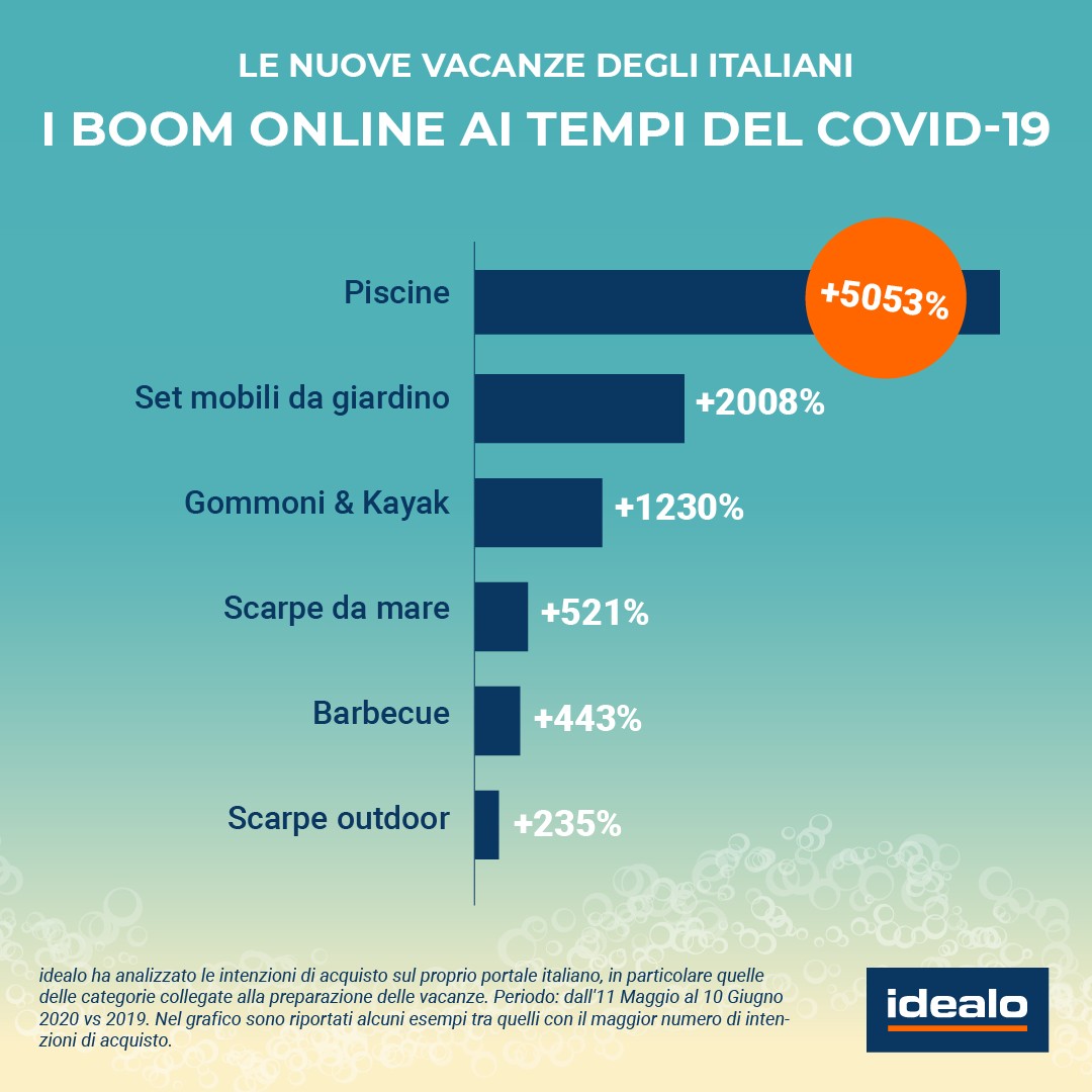 * In base alle intenzioni di acquisto online per 21 categorie di prodotti a tema vacanza in giardino o in campagna sul portale italiano di idealo. Periodo: dall’11 Maggio al 10 Giugno 2020, messo a confronto con lo stesso periodo del 2019.