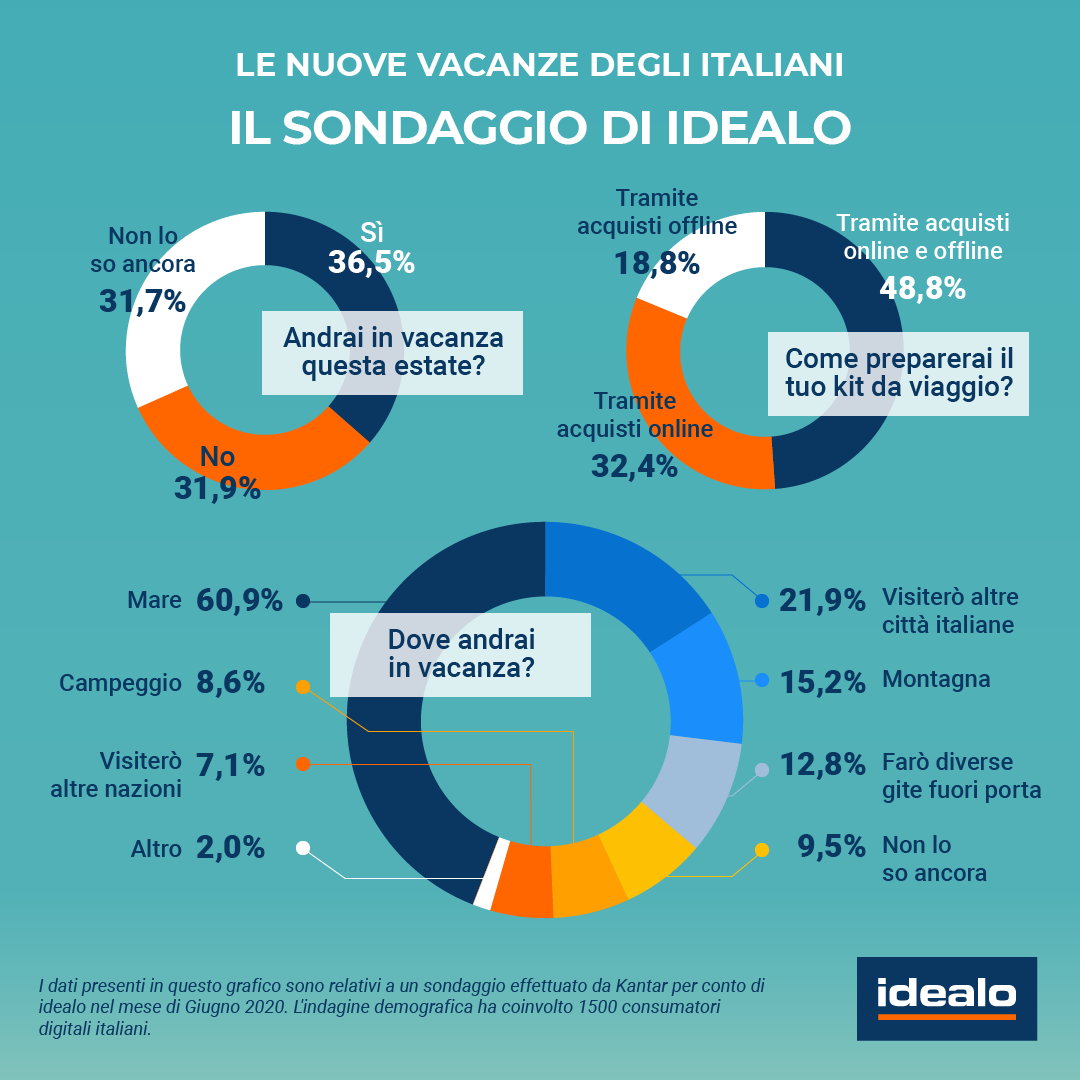 “Il periodo del lockdown e l’incertezza rispetto ai tempi e ai modi della riapertura hanno portato molti italiani a rimandare l’organizzazione delle vacanze – afferma Fabio Plebani, Country Manager di idealo per l’Italia – Per questo è molto interessante analizzare le ricerche dell’ultimo mese, che mostrano come gli italiani si stanno attrezzando e preparando a vivere l’estate. Sicuramente, che sia nel giardino di casa o per i più fortunati in qualche luogo di villeggiatura, la tendenza è ancora, dopo il lockdown, quella di utilizzare le ricerche online o una commistione di mondo fisico e digitale. Secondo il sondaggio commissionato da idealo, infatti, l’81,2% degli intervistati che faranno le vacanze ha risposto che per preparare il proprio kit da viaggio utilizza le ricerche online o una commistione di mondo fisico e digitale.”