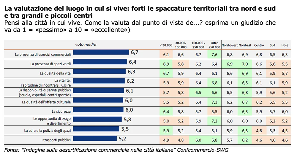 Per i cittadini italiani, la presenza di esercizi commerciali nel luogo in cui si vive, è l’elemento che vede la maggiore soddisfazione in assoluto e l’unico che riceve una valutazione positiva in tutte le aree del Paese e in tutte le tipologie di comuni, sia piccoli che grandi, in misura maggiore persino rispetto alla presenza di spazi verdi e di servizi pubblici, come scuole, ospedali, centri sportivi.