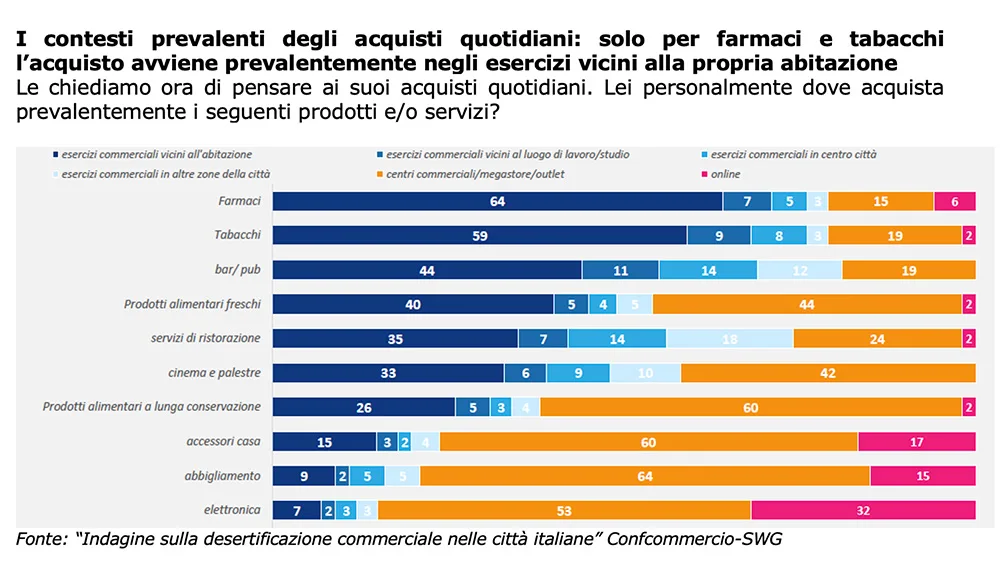 Secondo l’indagine sulla desertificazione commerciale nelle città italiane, promossa da Confcommercio, i negozi diminuiscono ma gli italiani vogliono vivere nei quartieri dove ci sono più esercizi di prossimità.
