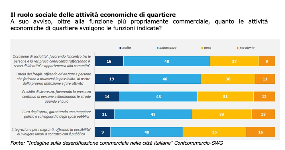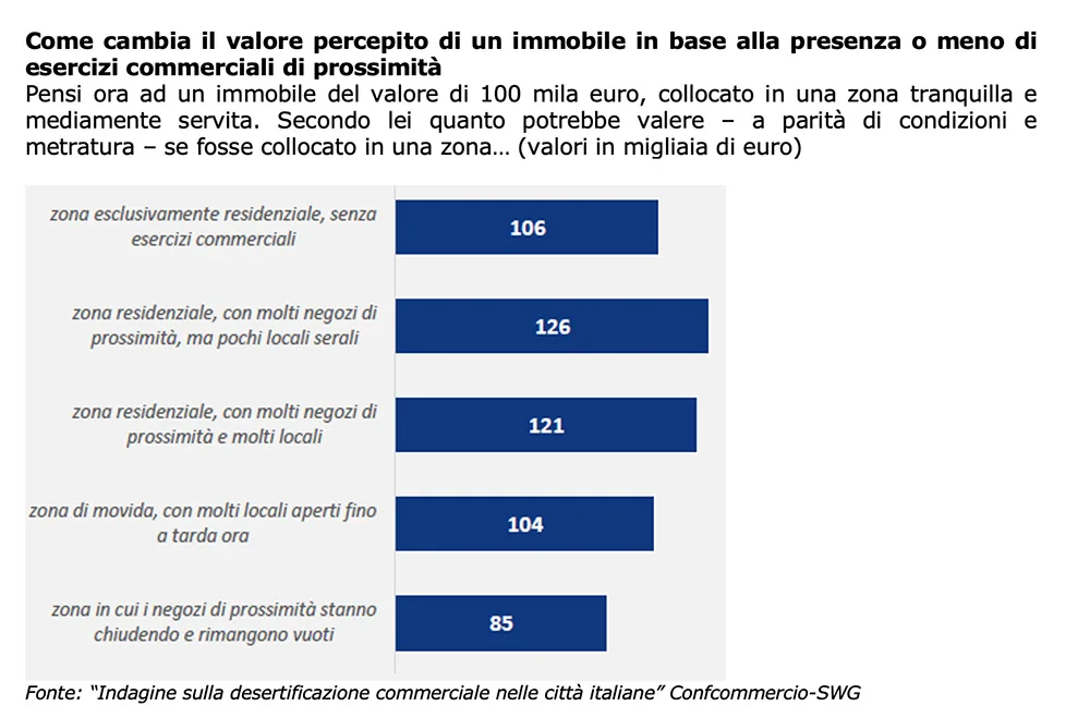 Molto significativi anche gli effetti della presenza dei negozi sui valori immobiliari: secondo gli intervistati, uno stesso immobile potrebbe vedere crescere il proprio valore almeno del 20% quando collocato in una zona residenziale con molti negozi di prossimità, mentre in un quartiere dove sono in corso fenomeni di desertificazione commerciale potrebbe perderne il 15%, con un differenziale complessivo, quindi, di oltre un terzo.