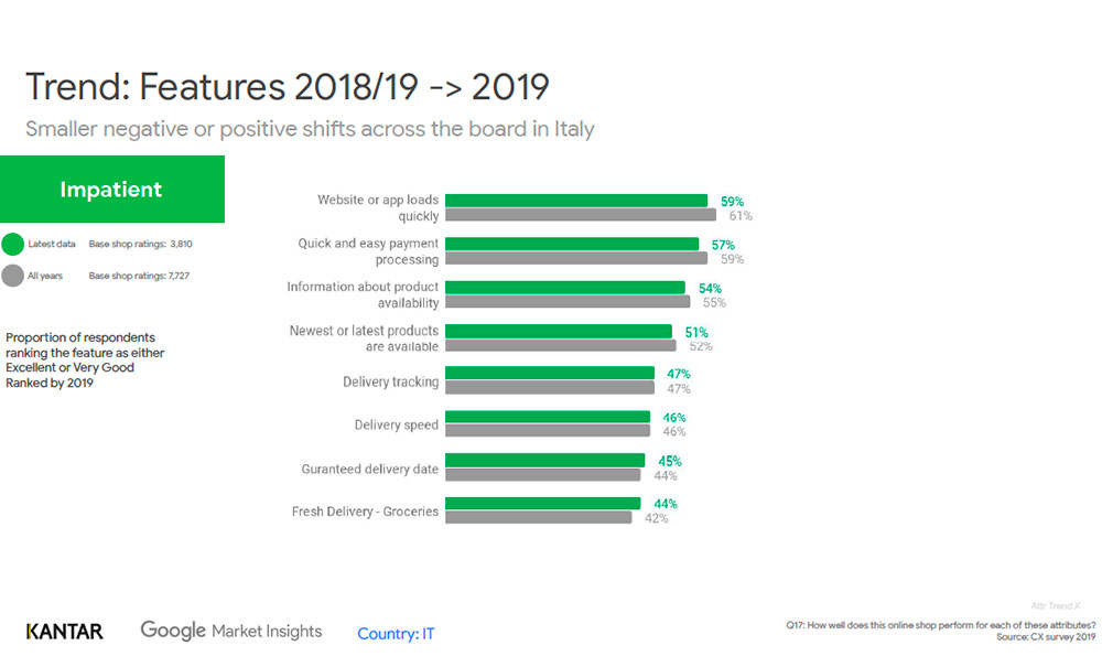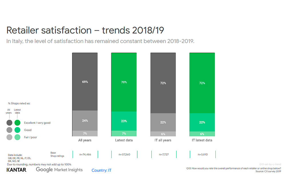 L’esperienza di acquisto passa ovviamente anche da quanto i retailer riescono a soddisfare le esigenze espresse dai consumatori, relativamente al processo di acquisto online. E a questo proposito Google ha commissionato, per il secondo anno, a Kantar una ricerca su questo tema – CX Retail Research – analizzando le risposte di 35.500 consumatori in 17 paesi Emea, di cui 2000 in Italia. Agli intervistati è stato chiesto di fare riferimento alle ultime 3 esperienze di acquisto nei settori relativi ad Abbigliamento, Arredamento, Elettronica, Generi Alimentari e multicategoria.