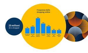 l dato sulla frequenza di acquisto online fornisce una prima stima dell’entità del fenomeno e delle sue trasformazioni rispetto al 2016. Alla guida del mercato digitale italiano restano i consumatori abituali, cioè quelli che comprano non meno di una volta al mese, ma in numero maggiore (56%, +4,6% vs 2016). Di seguito troviamo gli intensivi – una o più volte alla settimana – e gli sporadici, che acquistano una volta ogni trimestre o meno (entrambi 22%). Sulla base di questi numeri, la percentuale di chi effettua in media almeno un acquisto al mese è pari al 78%. Questo mostra che un e-consumer italiano su due acquista una volta al mese se non di più.