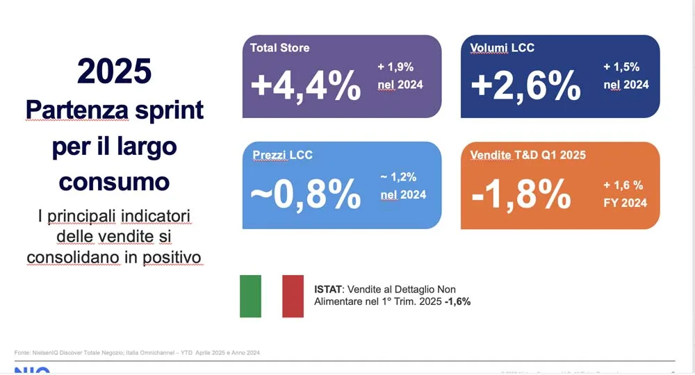 I primi 4 mesi di quest’anno maturano oltre 45 miliardi di euro di fatturato a totale negozio. Di questi oltre 32 nel Largo Consumo Confezionato. A supporto del trend di crescita, anche altri indicatori. Come il +4,4% a valore nel totale negozio (+1,9% nel 2024), e un +2,6% nei volumi del Largo Consumo Confezionato (+1,5% nel 2024). Tra le performance emerge quella del sud Italia con un trend di crescita dei volumi doppio rispetto alla media nazionale, in particolare +5,6% a valore e +5,0% a volume.