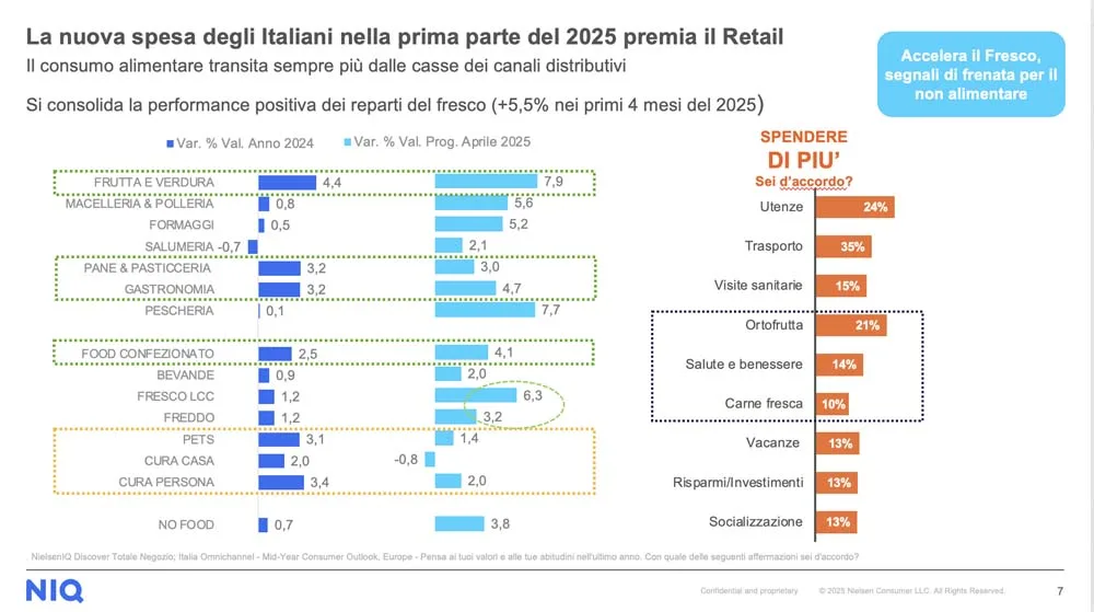 Stando alle rilevazioni di NIQ, a trainare la performance, nei primi 4 mesi, è il reparto del Fresco, con frutta e verdura che segnano un +7,9% a valore (+4,4% nel 2024). Bene anche carni e prodotti del food confezionato.