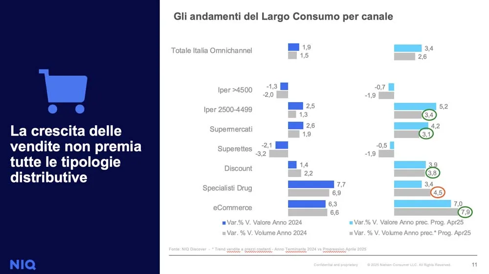 Fenomeno rilevato nell’80% dei gruppi della gdo, offrendo opportunità per incrementare la fedeltà. Bene i superstore (+3,4% a volume da gennaio ad aprile 2025 versus +1,3% nel 2024) e i discount (+3,8% a volume e +3,9% a valore nel 2025), complice la ricerca del risparmio. Gli specialisti drug sembrano rallentare la crescita, registrando comunque un interessante +4,5% a volume e un +3,4% a valore.