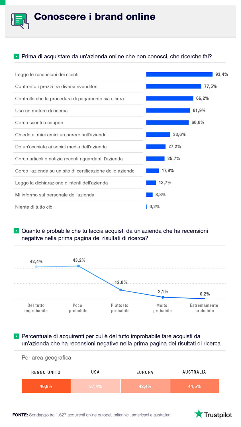 Claudio Ciccarelli, Country Manager di Trustpilot in Italia ha così commentato questi risultati: “Sempre più consumatori contano sulla ricerca online per reperire le informazioni necessarie a prendere le proprie decisioni di acquisto. Ciò che trovano può avere un forte impatto su come percepiscono un brand e sulla decisione di fare affari con esso. La gestione della reputazione un tempo era vista come una tattica passiva che le aziende utilizzavano soltanto se qualcosa andava storto all’interno della propria organizzazione. Ma oggi, i brand di tutte le dimensioni devono necessariamente avere un approccio proattivo nel pianificare la gestione della propria reputazione in modo da dare priorità alla comunicazione aziendale messa in atto e alla trasparenza del marchio, se vogliono che i clienti si fidino a sufficienza di loro da acquistarne i prodotti o i servizi.”