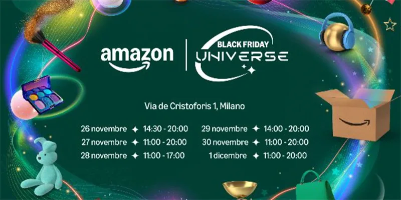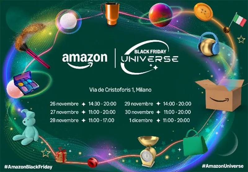 Dal 26 novembre al 1° dicembre, in Via De Cristoforis 1 a Milano, apre le porte Amazon Black Friday Universe, il pop-up store che trasporterà i visitatori in una colorata galassia tutta da scoprire. I clienti avranno la possibilità di esplorare una selezione di offerte disponibili in occasione della settimana del Black Friday e idee regalo originali per la stagione natalizia in arrivo, adatte a tutti i gusti, età e fasce di prezzo.