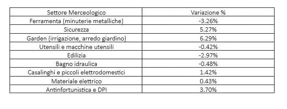 La tabella Assofermet mostra un mercato a due velocità. I comparti più dinamici sono il Garden (irrigazione, arredo giardino): +6,29%, la Sicurezza: +5,27% e l’Antinfortunistica e DPI: +3,70%