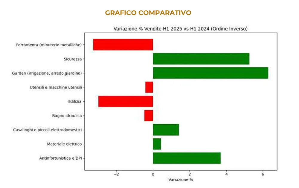 L’analisi sui volumi di vendita all’ingrosso — basata su un campione di operatori specializzati nella fornitura di ferramenta, casalinghi e materiali per l’edilizia — segnala un andamento differenziato tra i principali settori merceologici .