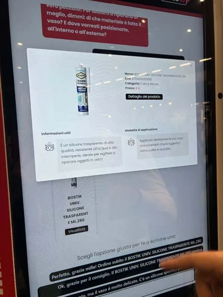 L’ultimo progetto è un assistente digitale che è stato chiamato “Tooli”. Di fatto un totem che, mediante un tool di intelligenza artificiale che offrirà assistenza tecnica al cliente. A questo si aggiunge la presenza di una bacheca smart dedicata all’interazione social, ai coupon e alla promozione. L’esperienza ha coinvolto un comparto specifico, quello degli adesivi, con uno scaffale completamente rivisto dove il cliente trova didattica, contenuti ed è stato realizzato in collaborazione, oltre che con i partner tecnici, con i fornitori Boston Saratoga, Henkel e Rapid.