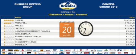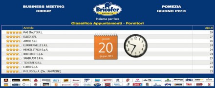 Una notizia per le aziende che non sono ancora fornitrici di Bricofer: considerando il successo della formula, ai tre appuntamenti ormai tradizionali del Business Meeting (marzo, giugno e ottobre) si andrà ad aggiungere nel 2014 un quarto appuntamento dedicato proprio alle aziende che vorrebbero avere rapporti e far conoscere i propri prodotti ai manager dell’insegna. Una scelta di apertura importante in un momento dove sono moltissime le aziende che denunciano la difficoltà di incontrare i buyer della grande distribuzione.
