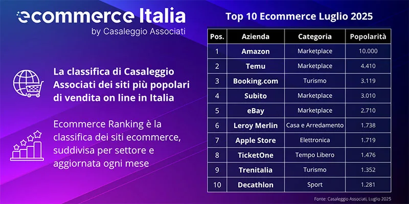 La Top 100 di luglio 2025 conferma la leadership generale di Amazon, seguita da Temu, in rapida ascesa anche nel mercato italiano. Nel panorama complessivo, oltre alla crescita stagionale dei siti legati al turismo, si osservano movimenti rilevanti in altri settori: Booking.com sale al terzo posto, mentre TicketOne guadagna l’ottava posizione.