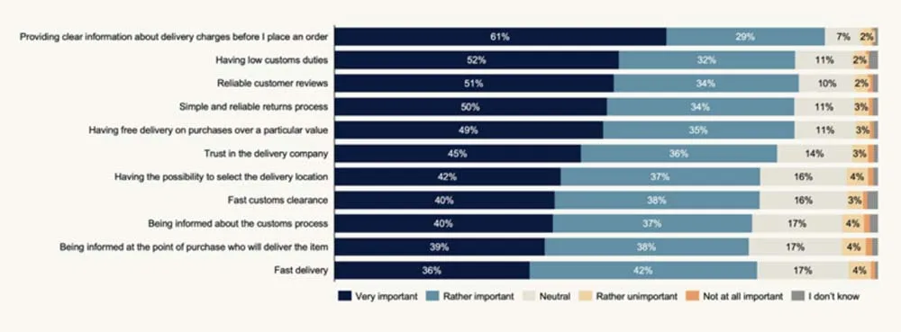 Quando si acquista online da un altro Paese, per il 61% dei consumatori è fondamentale avere informazioni chiare sulle spese di spedizione prima dell’acquisto. Circa la metà degli intervistati ritiene che siano essenziali dazi doganali bassi e recensioni affidabili da parte dei clienti.
