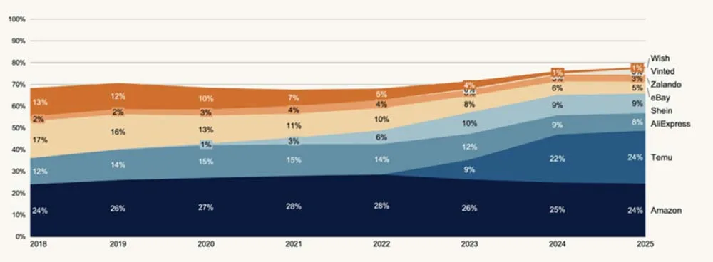 Il rivenditore online cinese Temu ha aumentato la sua quota di mercato nell’e-commerce transfrontaliero da meno dell’1% nel 2022 al 24% nel 2025, diventando il rivenditore online transfrontaliero più utilizzato insieme ad Amazon. Shein, nonostante la crescita esplosiva nel periodo 2020-23, ha mantenuto una quota di mercato stabile negli ultimi due anni. Tra il 2018 e il 2025, Wish ha perso il 95% della sua quota, eBay il 68% e AliExpress il 33%.