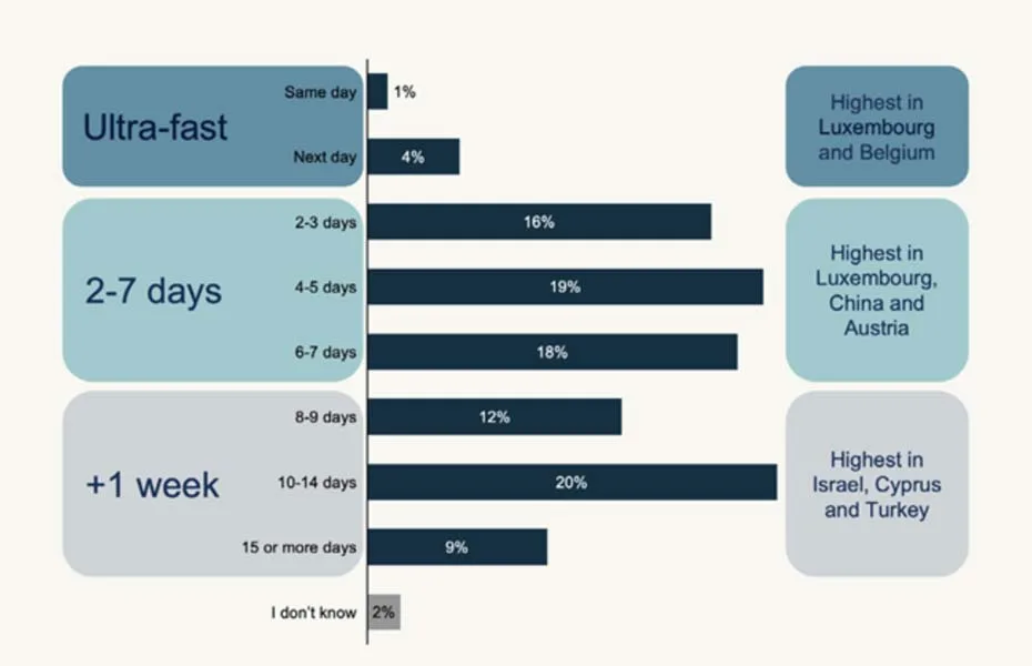 Agli intervistati è stato chiesto quanto tempo ha richiesto la consegna, dall’acquisto del prodotto online fino alla consegna dell’ordine. I tempi di transito più comuni sono stati 4-5 giorni (19%) e 10-14 giorni (20%). La consegna era solitamente più rapida per i consumatori dei paesi che acquistano principalmente dai paesi confinanti, mentre era più lenta per coloro che acquistano principalmente da mercati più lontani. La percentuale di pacchi che impiegano più di 15 giorni è diminuita drasticamente dal 29% nel 2020 al 7% nel 2025.