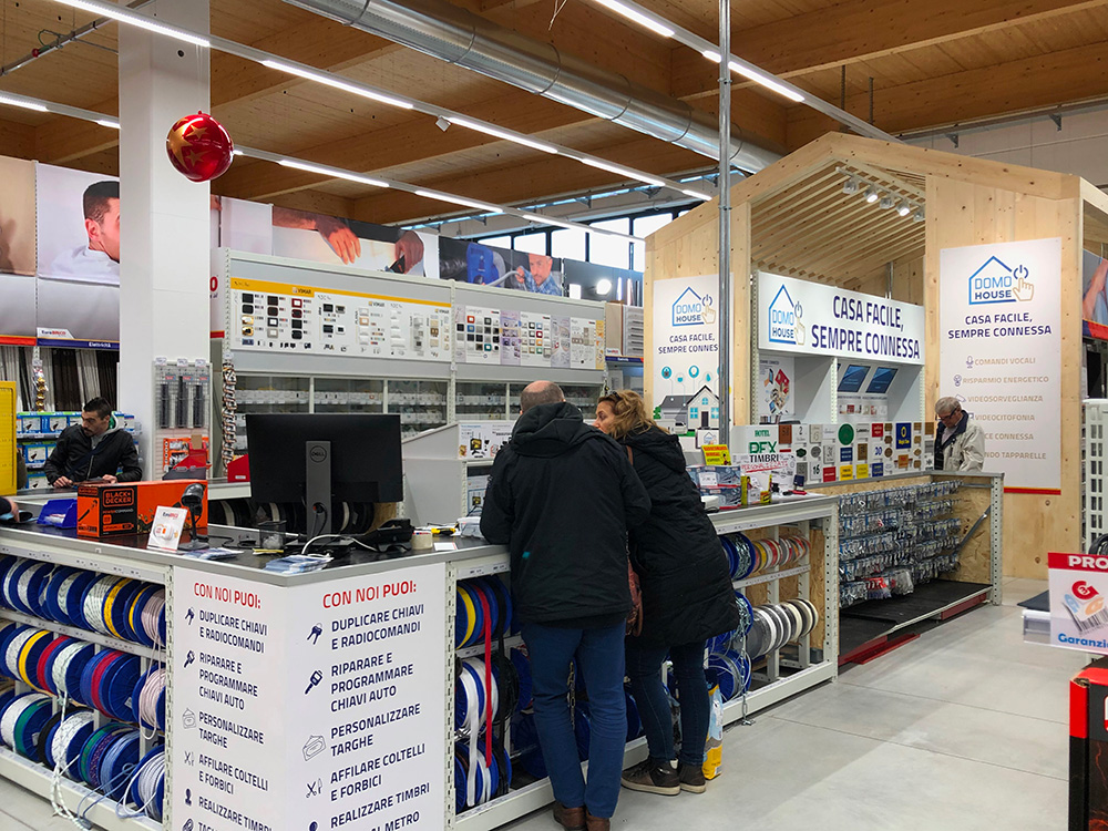 Presso il banco servizi, che è stato ampliato e implementato, si trova la vera e propria “new entry” dell’insegna. Si tratta della “Domo House”, uno spazio dedicato alla casa domotica, realizzato proponendo marchi importanti, con l’obiettivo di facilitare l’acquisto consapevole in una “materia” ancora un po’ complessa da capire per il cliente. “Abbiamo rivisto tutto l’assortimento, utilizzando un’esposizione e una didattica che punta ad accompagnare il cliente in un percorso di cultura e acquisto consapevole” spiega Panato. Ma non solo casa connessa, anche il risparmio energetico è un argomento importante, con la proposta di pannelli solari e fotovoltaici. “Anche in questo caso abbiamo voluto allestire un’esposizione dedicata al cliente finale, differentemente da altre insegne che si rivolgono prevalentemente al professionista. Forniamo un prodotto di buona qualità, ad un buon prezzo, comprensivo di servizio di installazione e post vendita, grazie alla collaborazione con un’azienda specializzata”.