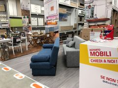 Per il reparto mobili segnaliamo un’area ambientata e poi un’esposizione molto razionale su rack, creata in modo molto chiaro e leggibile, sfruttando l’altezza. Naturalmente, considerando le dimensioni del negozio, l’offerta non si esaurisce sul punto vendita ma nell’attigua postazione web point.