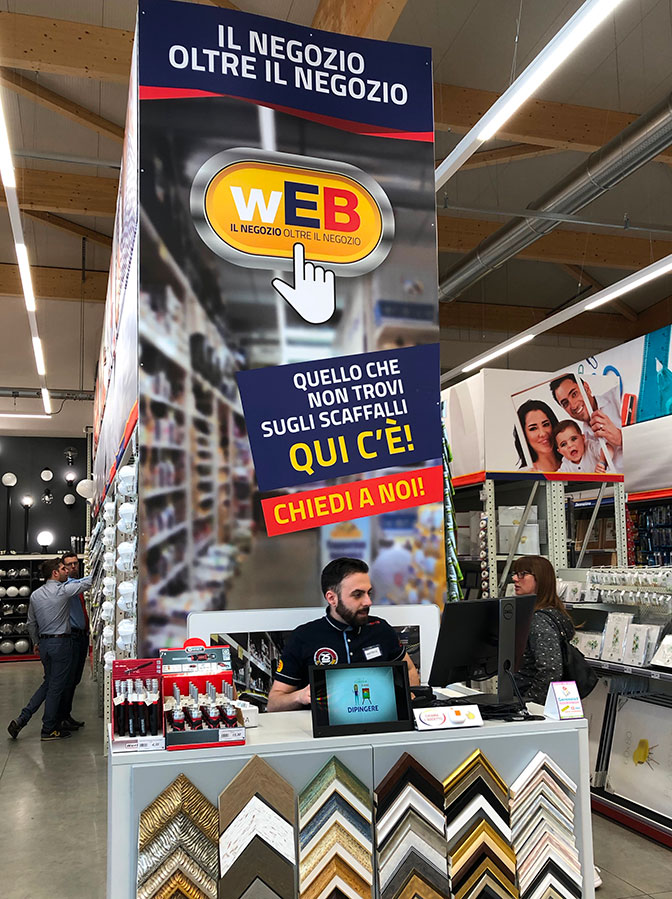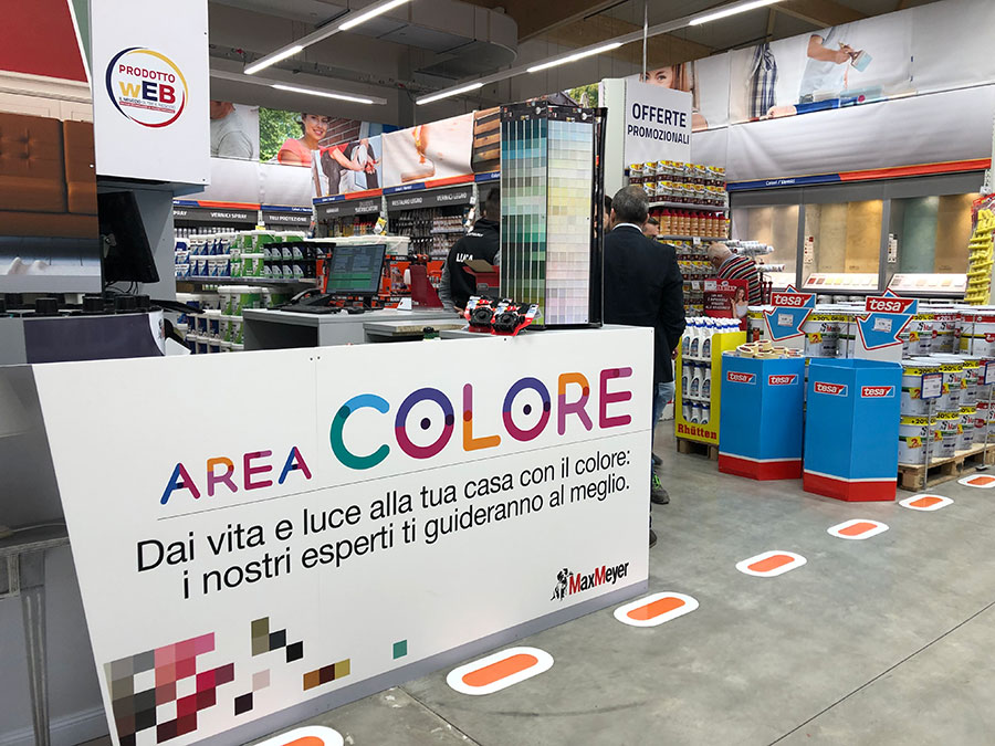 Il nuovo negozio presenta una superficie di 2.500 mq oltre ai 300 di area esterna. Anche qui, come negli altri, viene rimarcato il percorso circolare, un invito al cliente a visitare tutto il punto vendita. Il lay out prevede una divisone per mondi con una distinzione tra il settore più decorativo da una parte e quello tecnico sul versante opposto.