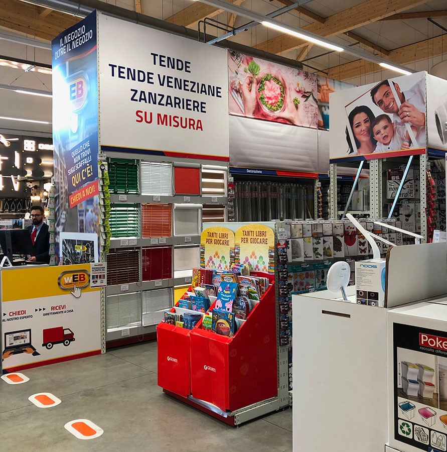 Per il reparto mobili segnaliamo un’area ambientata e poi un’esposizione molto razionale su rack, creata in modo molto chiaro e leggibile, sfruttando l’altezza. Naturalmente, considerando le dimensioni del negozio, l’offerta non si esaurisce sul punto vendita ma nell’attigua postazione web point.