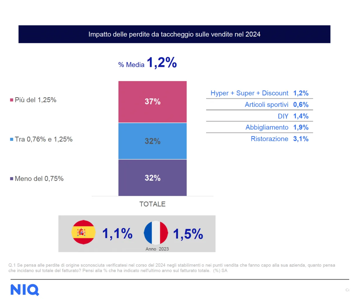 L’indagine sui furti nel retail 2025 realizzata da Nielsen Consumer/Checkpoint Systems e presentata a Milano il 5 novembre 2025, mette nero su bianco un dato che il canale conosce bene: nel 2024 le perdite di origine sconosciuta hanno pesato sull’1,2% dei ricavi totali del retail italiano, ma nel bricolage l’incidenza sale all’1,4%, sopra la media di canale e seconda soltanto all’abbigliamento tra i settori monitorati (ristorazione a parte). Per il sistema-Paese la stima economica è di 4,12 miliardi di euro, pari a 107 euro per cittadino.