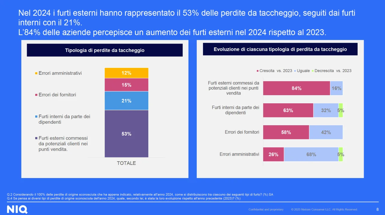 Il “Barometro sui furti nel retail 2025”, realizzato tramite un’indagine online con i responsabili sicurezza delle maggiori insegne della distribuzione moderna (alimentare e non food), conferma che i furti esterni sono ormai la componente principale della perdita: 53% del totale.