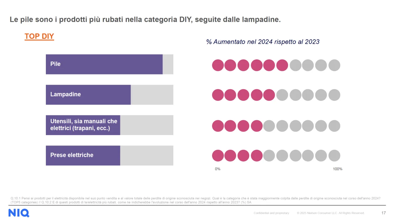 Guardando alle famiglie merceologiche più colpite nel bricolage, l’indice piazza al top pile, lampadine, utensili (manuali ed elettrici) e prese: prodotti fisicamente compatti, ad alto turnover e facili da occultare. È il profilo perfetto della merce “a rischio”, che sconta anche un valore pezzo contenuto e quindi una barriera psicologica al furto più bassa. Per molte insegne intervistate, la dinamica 2024 è stata peggiorativa rispetto al 2023.