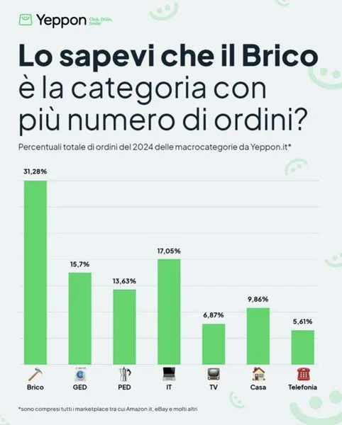 Avete dichiarato che, da gennaio 2024 a fine settembre, sul totale ordini Yeppon ben il 31,28% appartiene alla categoria Brico. Attestandosi, così, al primo posto come categoria merceologica. Una sorpresa?