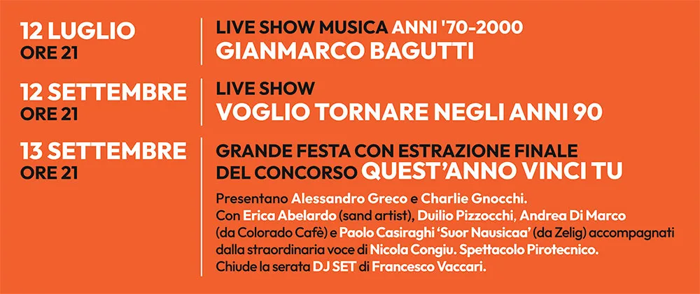 Se è vero che l’estrazione finale si terrà con una grande festa conclusiva il 13 settembre, sono previsti altri momenti conviviali. Il primo già avvenuto lo scorso 12 luglio, nello spazio esterno del punto vendita e, successivamente il prossimo 12 settembre con una festa che prevede l’esibizione del famoso gruppo “VOGLIO TORNARE NEGLI ANNI ‘90”.