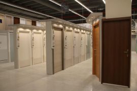 Porte e finestre. Lo spazio stock è situato alle estremità, mentre al centro si trova lo spazio show room e quello dedicato alla progettazione.