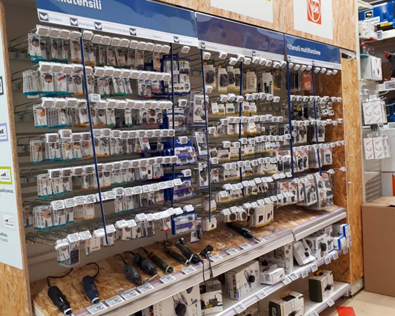 La fotografia di uno dei reparti più importanti e rappresentativi del centro bricolage. Gli Utensili Elettrici, un reparto al quale è sempre riservata uno spazio considerevole e una posizione di prestigio.