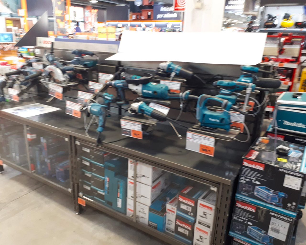 Visitiamo OBI nello storico negozio di Legnano, dove lo spazio è veramente molto ampio e in posizione strategica. 6+6 pareti contrapposte da 133 con le macchine, assortite, divise per modello (trapano, smerigliatrice ecc.)