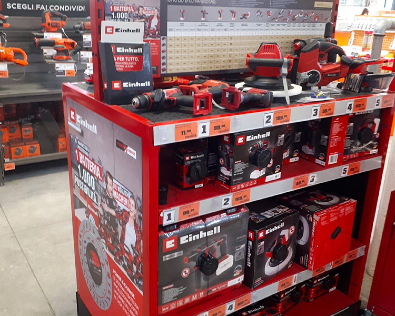 Ci sono poi degli ulteriori, specifici spazi monomarca: 2 moduli per Einhell, con una gamma ed una didattica dedicata alla batteria intercambiabile; 2 moduli per Makita, con connotazione professionale; 1 modulo ciascuno per B&D, Bosch, Worx e Stanley e per prodotti a batteria LUX, marchio proprio di OBI