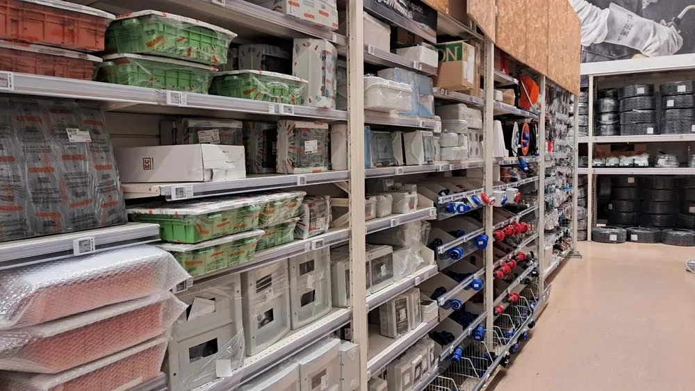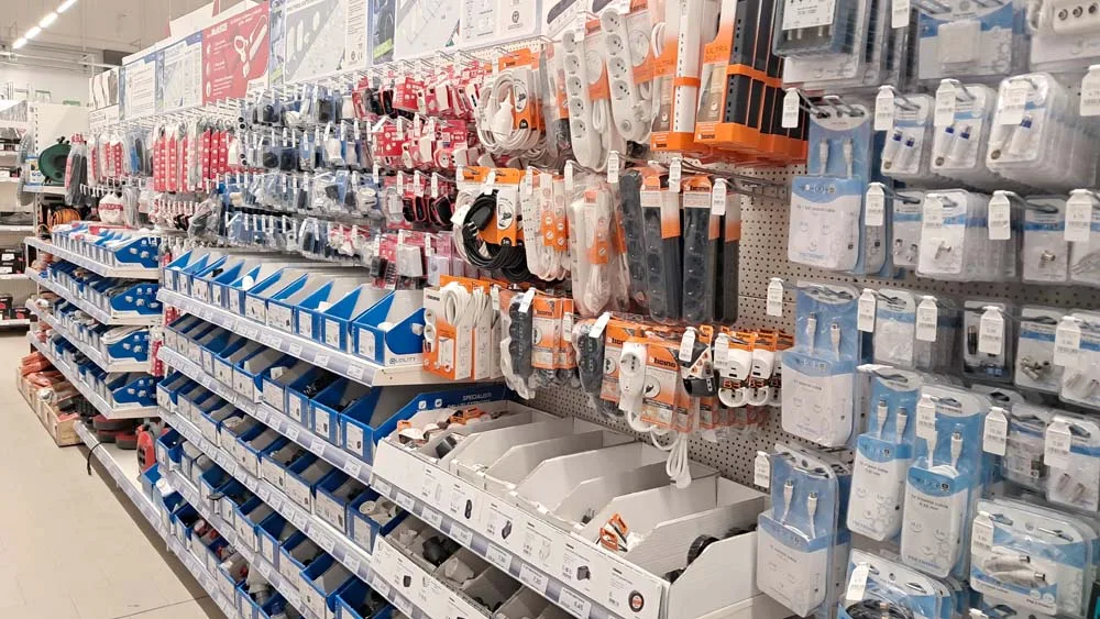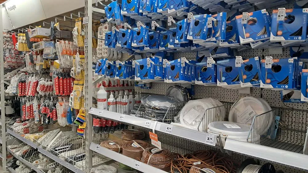 C’è un vasto assortimento di placche e frutti, di prese e contenitori da parete, cavi elettrici, tubi e canaline, prolunghe, avvolgicavo e spine multiple.