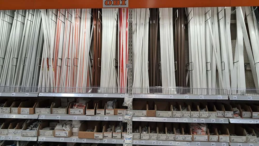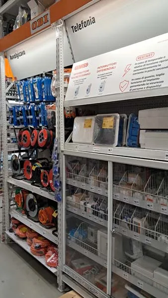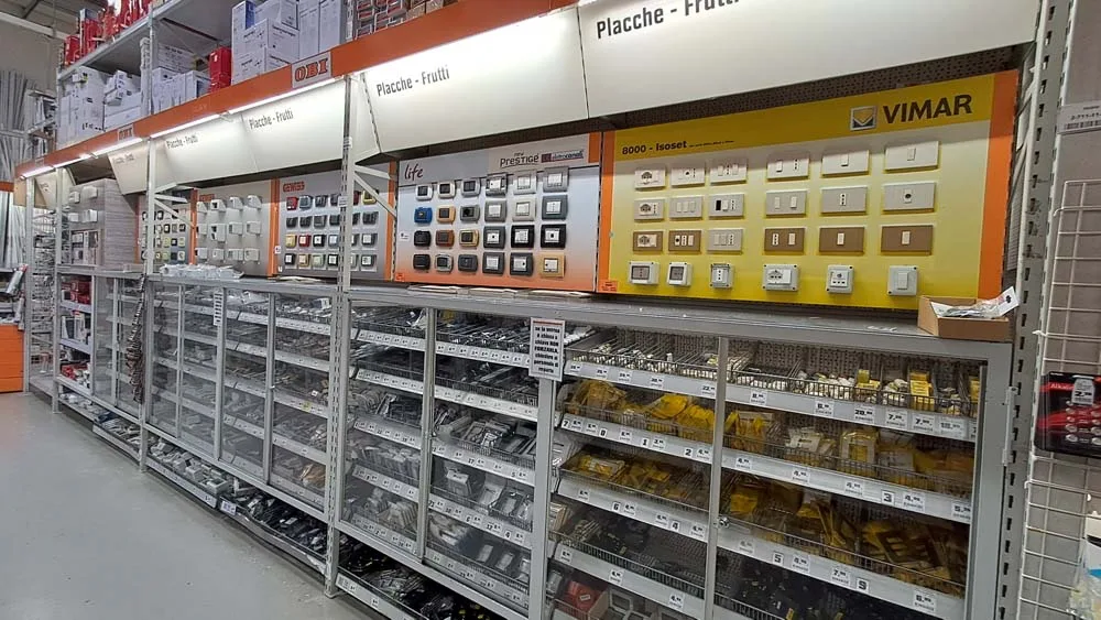 OBI ITALIA ha 2 corsie più tutta la lunga parete di fondo alle corsie stesse. Una corsia è dedicata a placche e frutti Vimar, B Ticino e Gewiss.