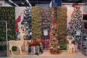 Leroy Merlin ha una parete di fronte all’ingresso, molto luminosa e scenografica, con addobbi di grandi dimensioni, alberi, decorazioni, luminarie e pupazzi.