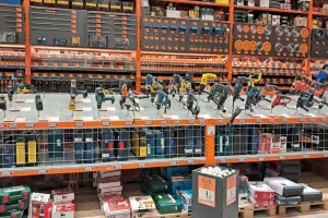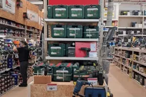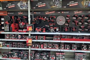 Nella grande esposizione, all’ingresso del punto vendita, c’è una corsia bifacciale, con solo due moduli per prodotti a batteria: uno per Dewalt ed uno per Makita.
