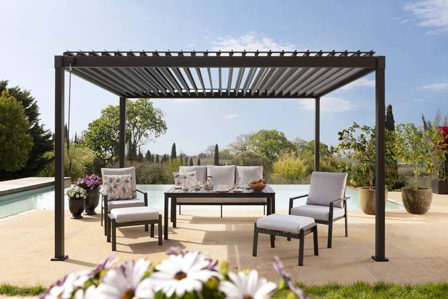 Il debutto della linea conta 270 referenze dedicate, articolate in tre aree: strutture architetturali come pergole che ridisegnano i volumi esterni; living & dining con tavoli e sedute in alluminio dalle linee essenziali; comfort relax con poltrone, lettini e complementi d’arredo.