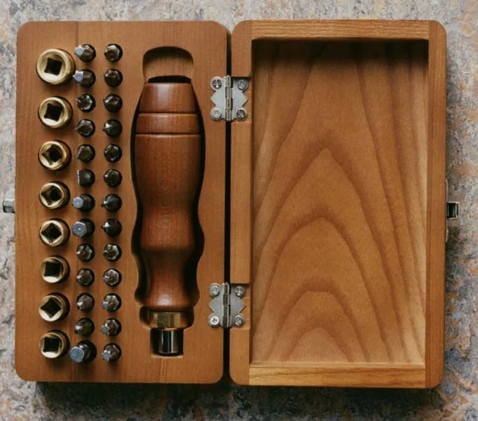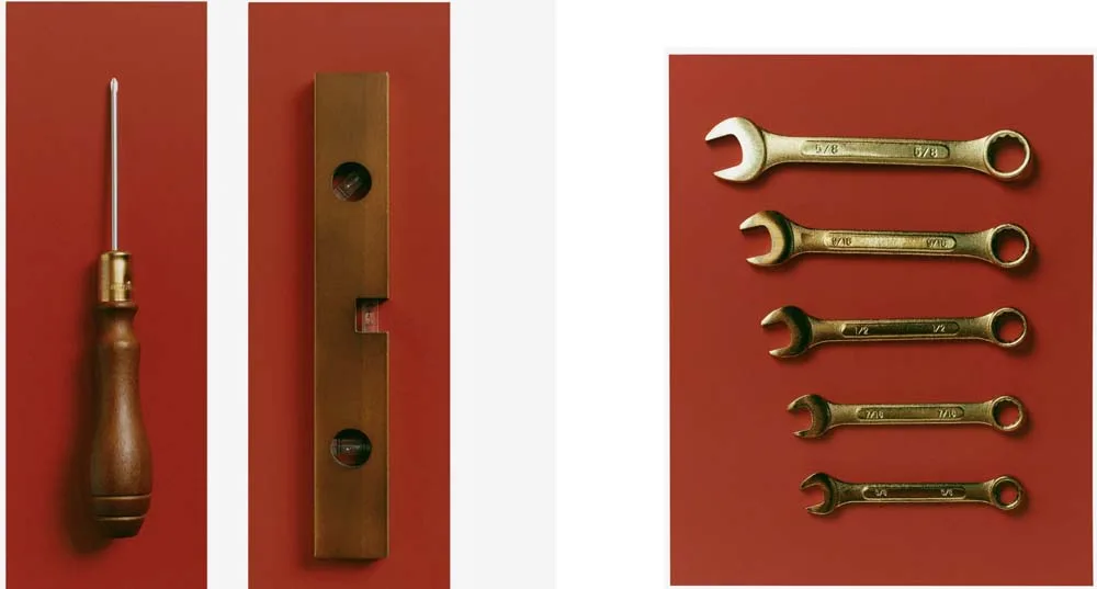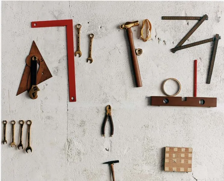 La collezione include strumenti che spaziano dalla livella in legno di faggio (19,99 euro) al metro pieghevole da falegname in betulla (9,99 euro), fino a pinze, martello e chiave con impugnature rivestite in pelle (17,99 euro ciascuno).