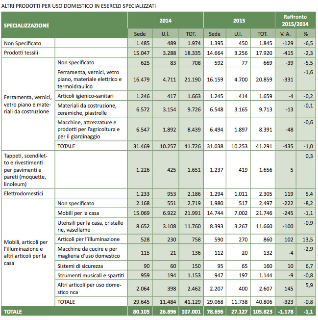 PS: Secondo l’ultimo “Rapporto sul Sistema Distributivo” (aggiornato al 2015) pubblicato da Ministero dello Sviluppo Economico, il commercio al dettaglio in sede fissa contava 751.585 unità. Di questi ben il 41,8% si trova al Sud e Isole, il 37,6% al Nord e il 20,6% al Centro. Di questi 41.291 sono catalogati come “Ferramenta/materiali da costruzione” e, di questi, 20.858 unità ulteriormente suddivisi tra “ferramenta/vernici/termoidraulica”.