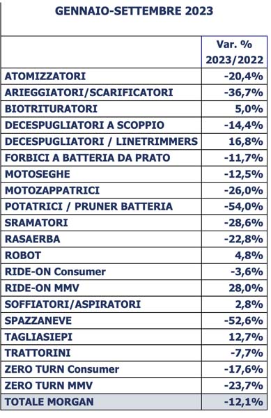 Lawn mowers drop 23%, chain hoes 26%, petrol brushcutters 14%, and chain saws 12%. The year’s weather pattern-characterized by high temperatures and low rainfall-has conspicuously penalized snowplows, which accumulate a 53 percent liability at the end of September.